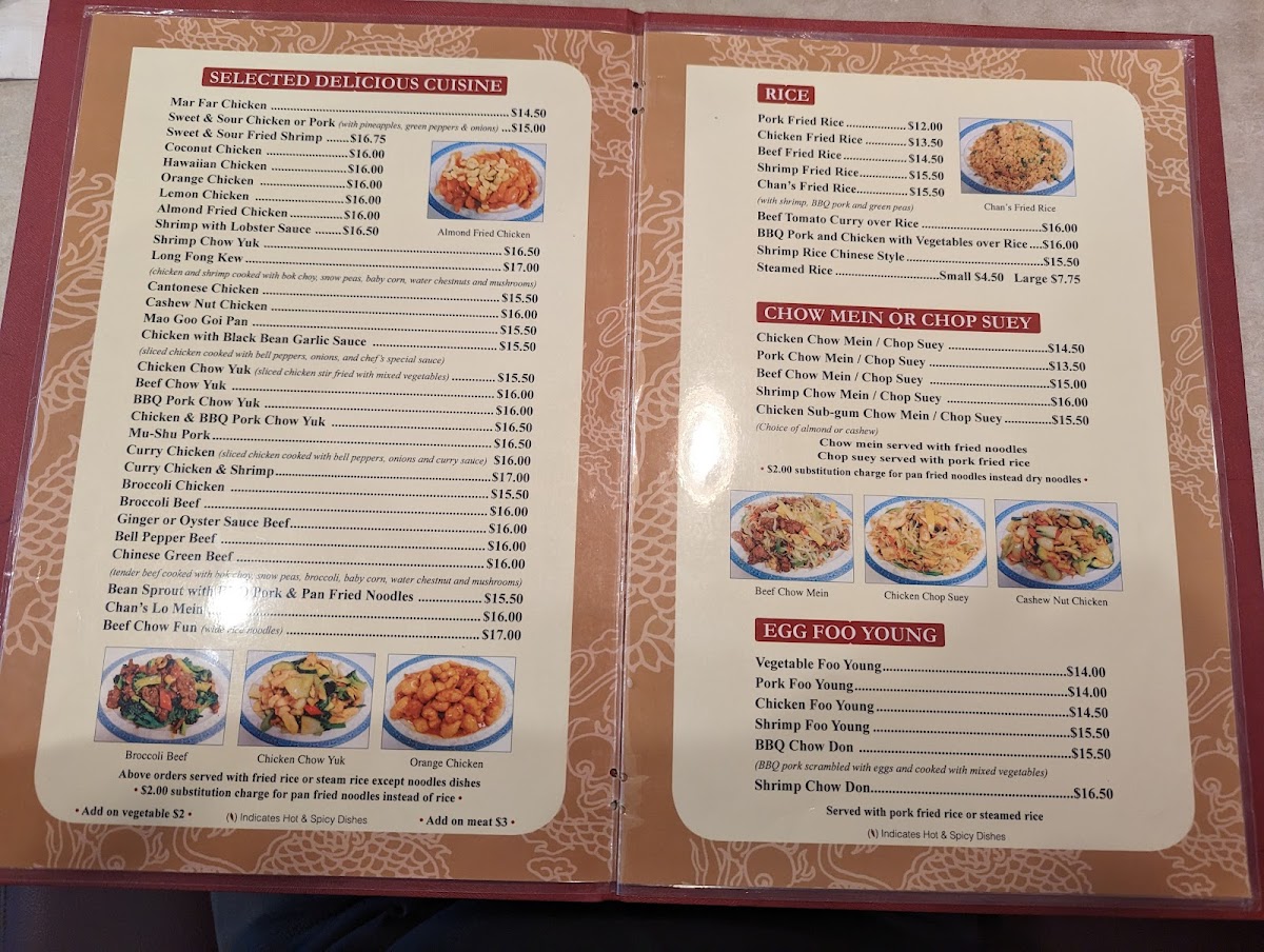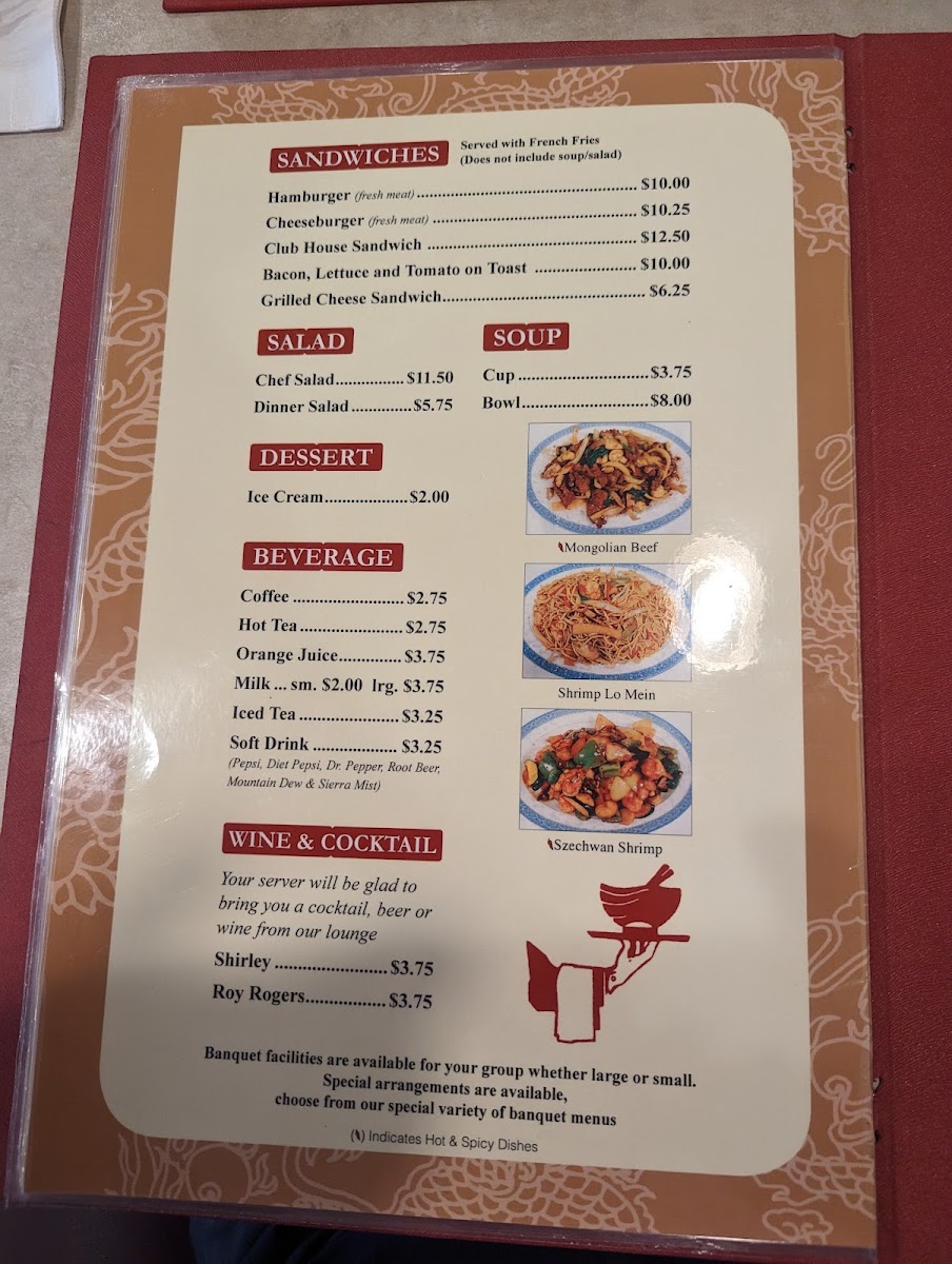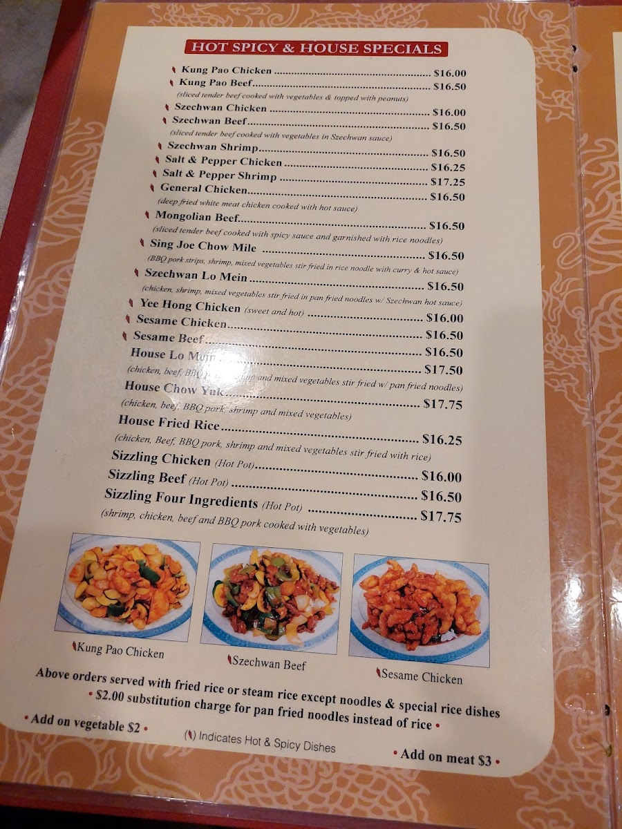 Overall, the menu reflects a straightforward, comforting approach to Chinese and American cuisine, meeting the needs of diners seeking familiar flavors served with steady, attentive service in a casual setting.