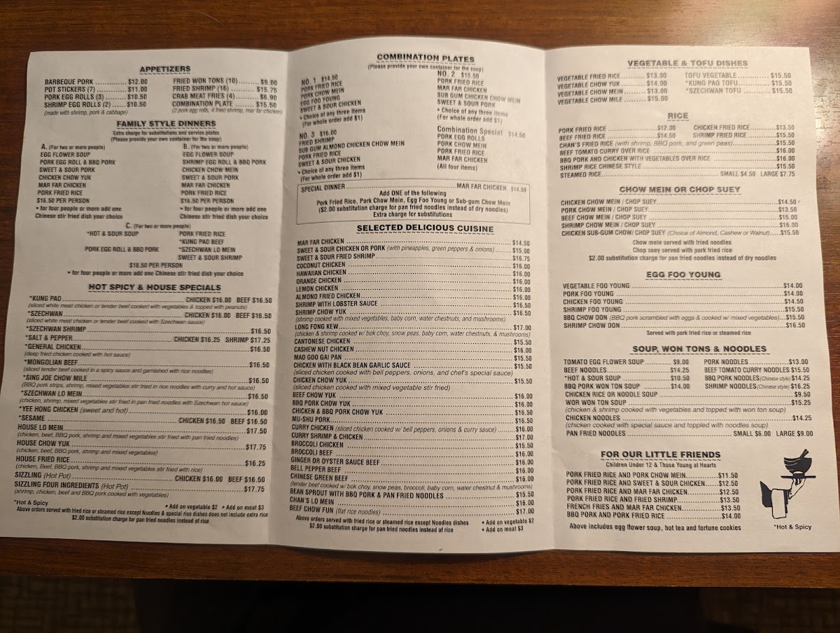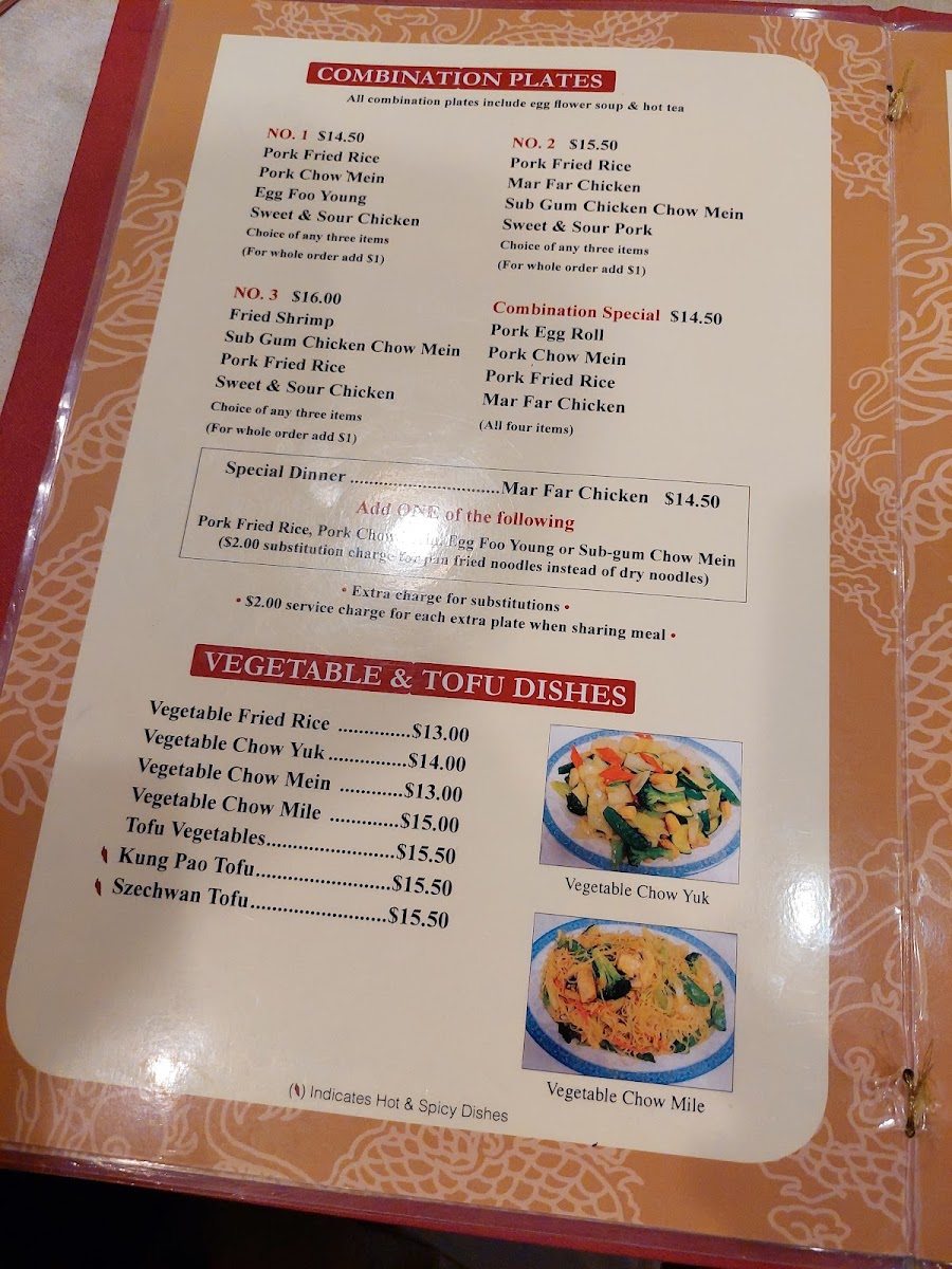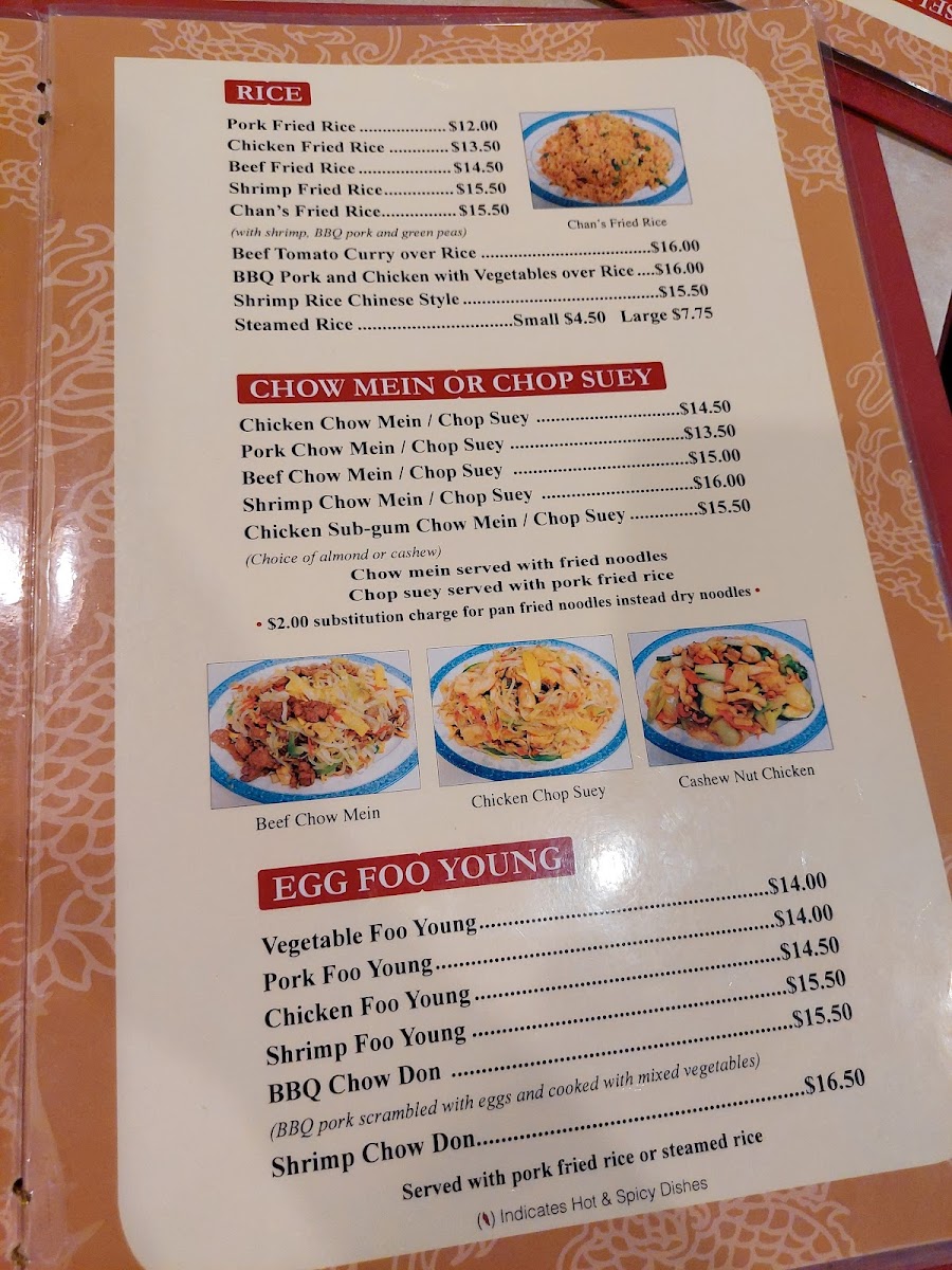 Overall, the menu reflects a straightforward, comforting approach to Chinese and American cuisine, meeting the needs of diners seeking familiar flavors served with steady, attentive service in a casual setting.